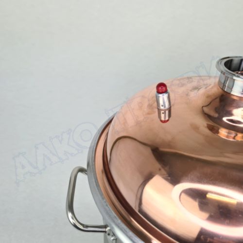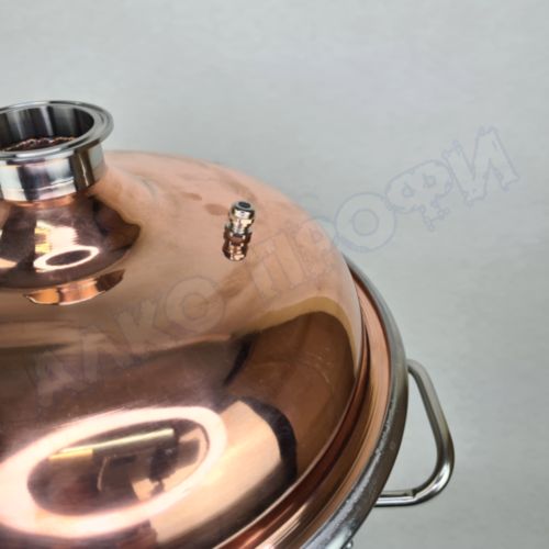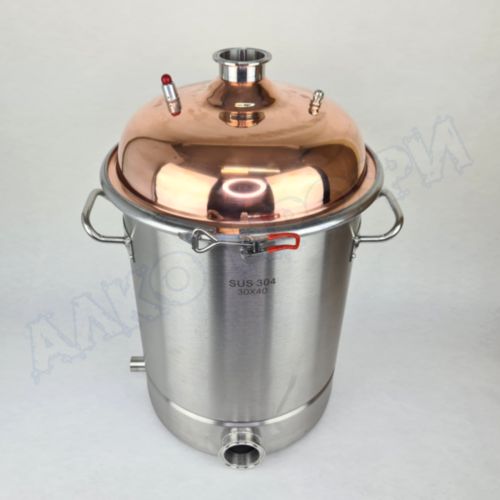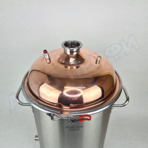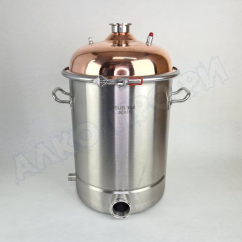 Перегонный куб из пищевой нержавеющей стали AISI 304 кастрюльного типа с крышкой из меди отечественного производства. Используется с дистилляторами (самогонными аппаратами) в качестве емкости нагрева спиртосодержащих жидкостей.