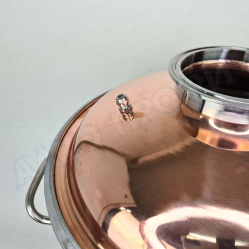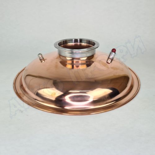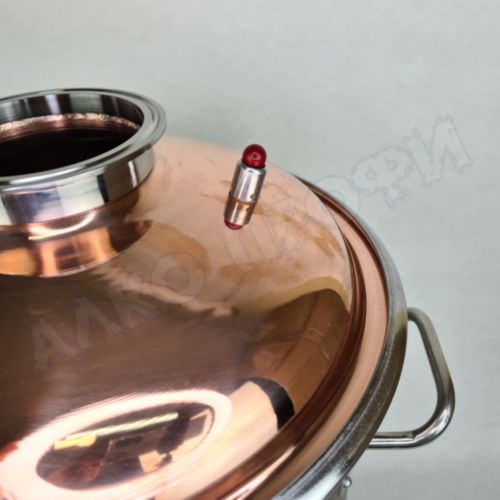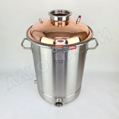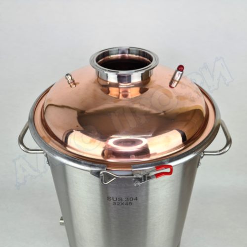 Перегонный куб из пищевой нержавеющей стали AISI 304 кастрюльного типа с крышкой из меди отечественного производства. Используется с дистилляторами (самогонными аппаратами) в качестве емкости нагрева спиртосодержащих жидкостей.