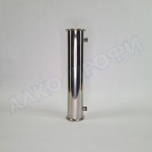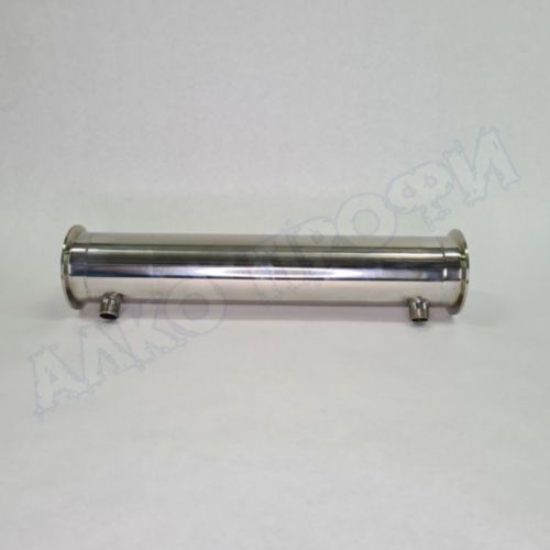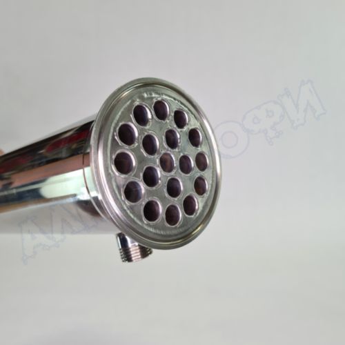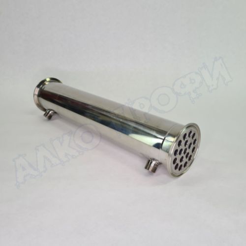 Кожухотрубный проточный холодильник служит для охлаждения больших объёмов пара и флегмы. Способен утилизировать большие подаваемые мощности, благодаря чему может быть использован и как холодильник и как дефлегматор. В режиме работы как холодильник охлаждает продукт самогоноварения. В режиме дефлегматора охлаждает флегму для её последующего отбора или рециркуляции.